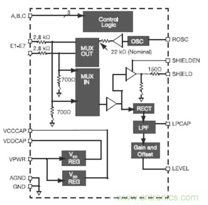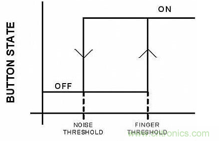 PCB還可能受到寄生電容的影響,這種電容最大可達20pF,它會在電容觸摸傳感器視為受到按壓時,使閾值發生偏移,從而改變其靈敏度。為了對寄生電容進行補償,可以采用對DAC編程的方法,以抵消CDC的輸入。對于各PCB來說,這種寄生電容是一致的,因此可以在制造PCB的時候進行簡單的調整,這樣就不需要外部RC調諧元件,從而使材料、裝配和測試相關的成本最低。單獨調整每個傳感器的偏移,使設計者可以充分利用轉換器的分辨率。
