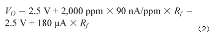 傳感器的最大響應為90 nA/ppm,如表2所示,其最大輸入范圍為2,000 ppm。因此,最大輸出電流為180 μA,最大輸出電壓由跨導電阻決定,如公式2所示。