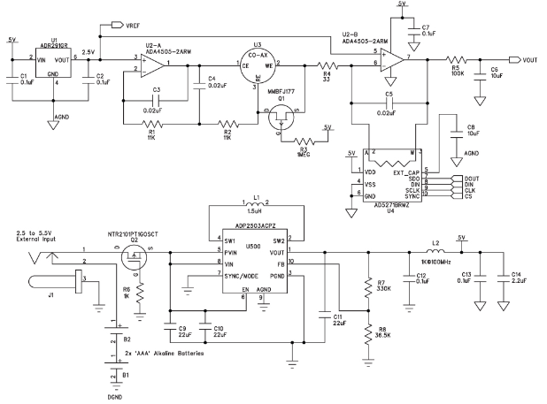 該電路由兩節AAA電池供電。使用二極管提供反向電壓保護會浪費寶貴的電能,因此本電路使用P溝道MOSFET (Q2)。該MOSFET通過阻塞反向電壓來保護電路,施加正電壓時導通。MOSFET的導通電阻小于100 mΩ,因此它引起的壓降遠小于二極管。除AAA電池以外,降壓-升壓調節器ADP2503還允許使用最高5.5 V的外部電源。在省電模式下工作時,ADP2503的功耗僅38 μA。由L2、C12和C13構成的濾波器可消除模擬電源軌產生的任何開關噪聲。連接外部電源時,該儀表不是通過一個電路來斷開電池,而是利用一個插孔以機械方式斷開電池,從而避免電能浪費。