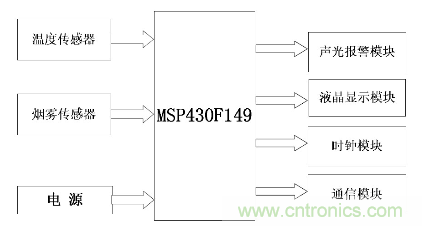 該系統(tǒng)以單片機(jī)MSP430F149 為核心,以環(huán)境溫度、煙霧濃度作為判斷火災(zāi)的依據(jù),完成了對(duì)火災(zāi)的預(yù)警。主要由單片機(jī)控制模塊、時(shí)鐘模塊、煙霧濃度測(cè)量模塊、DS18B20溫度測(cè)量模塊、聲光報(bào)警模塊、1602 液晶顯示模塊和電源構(gòu)成。