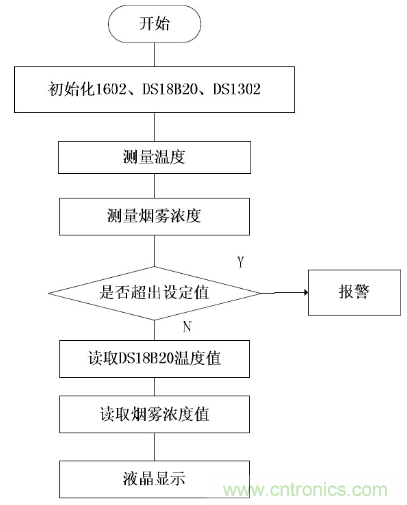 系統(tǒng)軟件流程圖上電后首先對(duì)單片機(jī)、1602 和DS1302 進(jìn)行初始化,初始化完成后,對(duì)溫度和煙霧濃度進(jìn)行測(cè)量,將測(cè)量值與設(shè)定值進(jìn)行比較,如果超出設(shè)定范圍,則進(jìn)行報(bào)警,如果未超出,則在液晶上顯示時(shí)間、溫度值和煙霧濃度值。