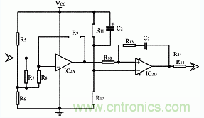 由D1、R15~R18、C6及IC 2C組成,由R18引入正反饋。當前級信號頻率低于一定值F1時,IC 2C的8腳輸出低電平;當前級信號頻率高于一定值F2時,IC 2C的8腳輸出高電平。臨界過渡區頻率范圍FW=F2-F1,適當的FW可以有效防止檢測信號臨界過渡區的輸出振蕩,使得檢測動作可靠。