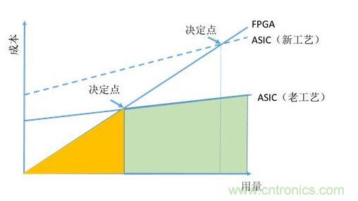 從上圖可以看出,FPGA由于沒有NRE,在用量較小的時候成本優勢明顯。由于FPGA單個芯片成本高于ASIC,所以有較大斜率。在決定點位置以后,ASIC開始有成本優勢。所以從成本因速考慮選用FPGA還是ASIC,與用量有很大關系。