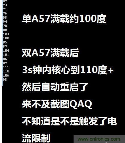 那么810的功耗有多高呢,根據(jù)貼吧大神(炮神)ioncannon的分析,在Z9 Max上,810的單核心功耗最高可以達(dá)到5W(注意是單核心!單核心!單核心! 重要的事情要說三遍),雙核A57同時(shí)滿載3S就發(fā)熱達(dá)到110攝氏度,并自動(dòng)重啟了,想測(cè)試下雙核的功耗都以為爆機(jī)沒辦法測(cè)試了。
