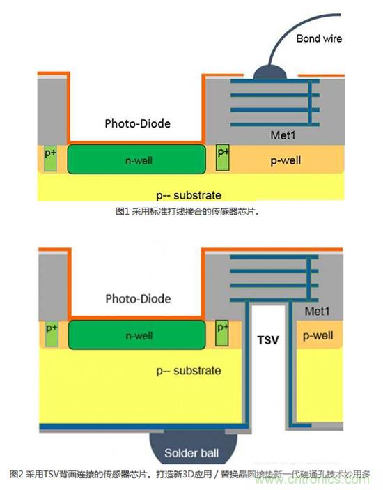 模擬3DIC技術通常是透過建造芯片正面到IC背面的電氣連接來實現傳感器應用。 在許多傳感器應用,例如光學、化學、氣體或壓力傳感器中,感測區域是位在CMOS側(晶圓的頂端)。 芯片和導線架之間最常用的連接是打線接合(Wire bonding)(圖1)。 無論是使用塑料封裝,或是將裸片直接接合在印刷電路(PCB)或軟性電路板上,對于某些會將感測區域暴露出來的應用而言,打線接合并非理想的解決方案。 采用專業晶圓代工業者的專有TSV技術,可以利用TSV、背面RDL和芯片級封裝(WLCSP)(圖2)來替代打線。