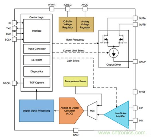 超聲波傳感技術也是一項具有成本競爭力的技術,特別是在使用PGA460等集成解決方案時,其中已包括大部分所需的芯片。PGA460既可以使用半橋或H橋直接驅動傳感器,也可以使用變壓器驅動傳感器;后者主要用于密封的的“密閉”傳感器。PGA460還包括用于接收和調節超聲回波的完整模擬前端。此外,該器件還可以通過數字信號處理來計算ToF(見圖4)。