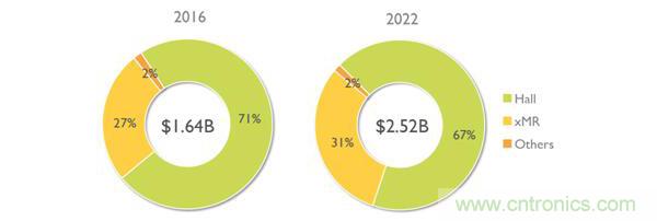 xMR磁阻傳感器市場的增長或與霍爾技術相結合,或搶占了后者的市場份額。根據(jù)Yole發(fā)布的《磁傳感器市場與技術-2017版》報告, xMR技術的主要優(yōu)勢體現(xiàn)在更高的靈敏度,因此它們主要用于電子羅盤和位置測量,尤其是精確的角度測量應用。