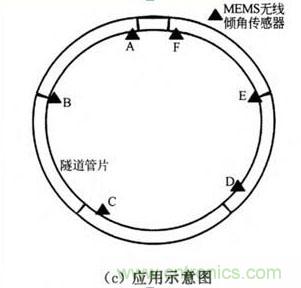 無線傾角傳感器采用電池供電,將MEMS無線傾角傳感器安裝在盾構(gòu)隧道內(nèi)襯砌圓環(huán)的管片上,包括封頂塊、鄰接塊、標(biāo)準(zhǔn)塊、封底塊和塊與塊間以環(huán)向螺連接構(gòu)成的縱向接頭等不同部位;實(shí)時測量隧道管片內(nèi)各部位的傾斜角度,通過組合計算得出管片的實(shí)際形變,實(shí)現(xiàn)對隧道結(jié)構(gòu)變化準(zhǔn)確、有效地實(shí)時監(jiān)測,應(yīng)用示意如圖(c)所示。