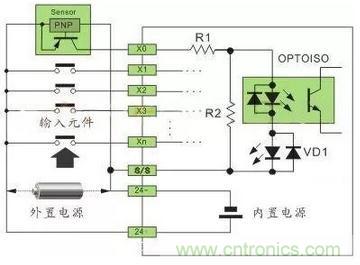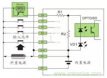 直流電可以由PLC內部提供也可以外接直流電源提供給外部輸入信號的元件。R2在電路中的作用是旁路光電耦合器內部LED的電流,保證光電耦合器LED不被兩線制接近開關的靜態泄漏電流導通。