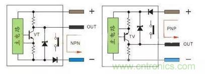 PNP型當傳感器有檢測信號VT導通,正極的電流流向輸出端OUT,輸出端OUT電位接近正極,通常說的低電平翻轉成高電平。