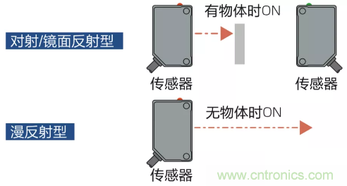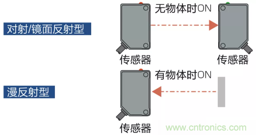 對(duì)射型/鏡反射型傳感器有物體時(shí)輸出ON;漫反射型傳感器無物體時(shí)ON