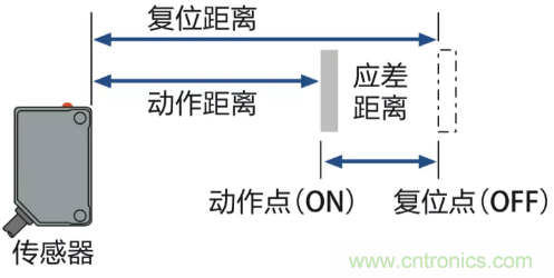 檢測(cè)物從遠(yuǎn)到近靠近傳感器直到輸出變?yōu)镺N的位置為動(dòng)作距離,從此位置往外移動(dòng)直到輸出變?yōu)镺FF的位置為復(fù)位距離。應(yīng)差距離=復(fù)位距離-動(dòng)作距離
