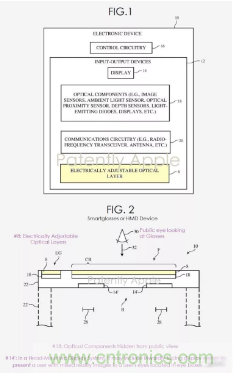 蘋果公司希望通過此專利推進其在可調(diào)節(jié)光學層上的技術(shù)發(fā)展。此發(fā)明支持使用者對智能眼鏡的光學層進行模式調(diào)節(jié),例如按照個人喜好調(diào)整光學層的明暗。下圖1是具有光學組件和電可調(diào)光學層的電子設備示意圖;下圖2是頭戴式設備采用電可調(diào)光學層(#8)的示意圖。