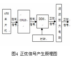 采用DDS技術在當前的測試測量行業已是一種主流的做法,其頻率精度可隨相位累加器的位數而定。本系統采用單片機+專用DDS芯片的方式產生正弦信號,其原理如圖4所示,ARM單片機向CPLD 發出控制命令,CPLD 在時鐘下譯碼后產生DDS的控制信號,產生出相應頻率的正弦波信號,該正弦信號經過濾波放大后,輸出相應幅值的正弦信號。