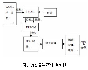 曲軸位置信號(CPS)是PCM控制點火系統中最主要的傳感器信號,為適應多種PCM的需求,設計采用CPLD和DA的方式產生。CPS信號產生原理如圖5所示,在EPROM中存有一個周期的正弦表數據,當需要產生 CPS信號時,ARM單片機對CPLD進行設置,CPLD根據接收的控制命令,通過時鐘計數,產生讀存儲器的信號,并向EPROM提供合適的地址信號和控制信號,EPROM輸出相應地址的數據,經D/A轉換,變成單端CPS模擬信號,然后經濾波電路和單端轉差分處理電路,輸出CPS差分信號。在實際的電路實現中,對CPS信號的控制可由計算機通過CAN總線向ARM發出控制命令進行設置,因此,即使ARM芯片在運行過程中復位,電路仍能輸出正確的CPS信號,以確保測試周期的正常進行。