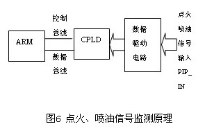 點火和噴油信號是汽車發動機中的關鍵信號,其周期和時序直接關系到汽車的運行狀態,因此監測它們的周期和時序尤為重要。本系統監測原理圖如圖6 所示,對于點火信號的監測,主要是監測它與CPS信號的同步,以及兩個或四個點火信號之間的時序關系。當CPLD尋找到點火信號與CPS同步的起始點后,根據輸入的PIP_IN信號,對各點火信號進行計數。每當一個點火周期完成后,在下一個點火周期向ARM 單片機產生一個中斷信號。該中斷信號觸發ARM 單片機進入中斷處理程序,在該中斷程序中,ARM單片機讀入對各點火信號的計數值,判斷點火信號的時序和周期,并設置點火信號正常與否的標志。對于噴油信號的監測,主要是監測它與CPS信號的同步,以及它們之間的時序關系。當PIP_IN信號中四個噴油信號中任何一個信號的下降沿到來時,CPLD都會監測其它三個噴油信號的狀態,如果其它三個噴油信號的狀態正常,即給出噴油信號正常標志,反之給出噴油信號異常標志。